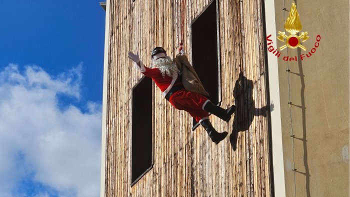 Babbo Natale, arrivato a bordo dell'elicottero dei caschi rossi, si è poi calato dalla torre, raggiungendo il piazzale e ricevendo l'abbraccio di tanti bambini.
