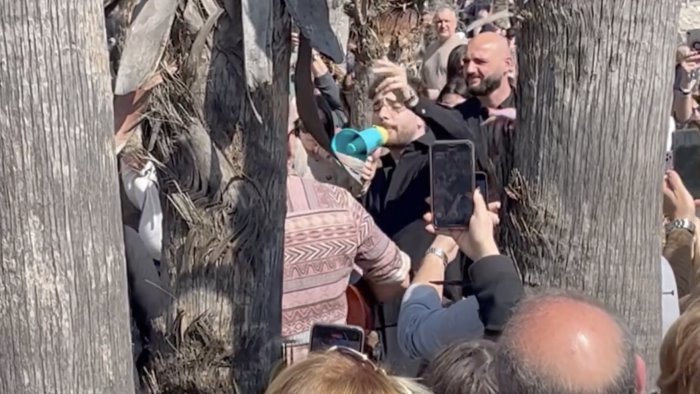 In una Salerno gremita di persone e baciata dal sole, Rocco Hunt ha improvvisato un'esibizione in riva al "suo" mare. Intorno alle 13.30 il rapper di Santa Margherita ha fatto capolino sul solarium di Santa Teresa, sul lungomare Trieste. Una presenza che non è passata inosservata e che, ben presto, si è trasformata in una gradita sorpresa per i tanti presenti. "Rocchino" ha imbracciato un megafono e ha cantato live "Mille vote ancora", il brano con cui ha partecipato all'ultima edizione del Festival di Sanremo. La folla, emozionata ed euforica, ha circondato l'artista, accompagnandolo nella sua performance. In tanti hanno immortalato la scena che è diventata in poco tempo reale. Tanti altri hanno approfittato della presenza di Rocco Hunt per scattare una foto ricordo: tra questi anche Luca Fusco, bandiera della Salernitana e attuale allenatore della formazione Primavera granata. «Grande poeta urbano, orgoglio di Salerno», ha scritto sui social l'ex calciatore che ha postato in rete anche il video dell'esibizione dell'artista.