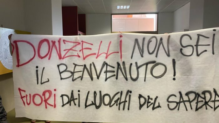 Con cori e striscioni, un gruppo di studenti di sinistra, ha contestato il deputato di Fratelli d'Italia, Giovanni Donzelli, all'Università di Salerno per un incontro con i giovani di Azione Universitaria e per un convegno sull'Autonomia Differenziata. “Donzelli non sei il benvenuto, fuori dai luoghi del sapere, il messaggio esposto dai contestatori a cui il responsabile organizzativo nazionale di Fdi ha replicato con il sorriso.