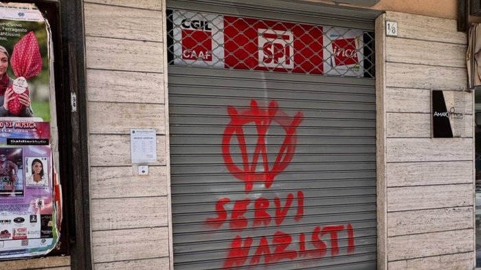 Con queste parole Franco Tavella, segretario dello SPI CGIL Napoli e Campania, commenta il gravissimo atto vandalico compiuto nella notte ai danni della sede SPI CGIL di via Francesco Crispi a Salerno, dove ignoti hanno imbrattato la saracinesca con scritte offensive e simboli riconducibili a gruppi No Vax e neofascisti. Tra le scritte, una vergognosa accusa: “Servi nazisti”.