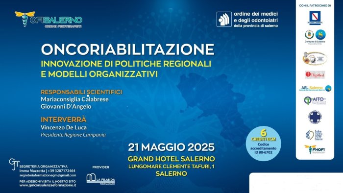 Si terrà il prossimo 21 maggio, presso il Grand Hotel Salerno, a partire dalle ore 9:00, il convegno dal titolo “Oncoriabilitazione – Innovazione di politiche regionali e modelli organizzativi”, organizzato congiuntamente dall’Ordine dei Fisioterapisti di Salerno e dall’Ordine dei Medici Chirurghi e Odontoiatri di Salerno. L’evento sarà un’occasione per approfondire l’importanza dell’onco-riabilitazione e della presa in carico precoce del paziente oncologico, con particolare attenzione al ruolo strategico del fisioterapista sin dalla fase di pre-habilitation.