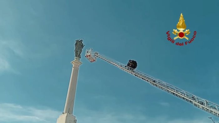 Con il supporto dell'autoscala, i caschi rossi hanno cinto l'effigie con una corona di fiori: una consolidata tradizione che contraddistingue questa giornata di festa per Salerno.