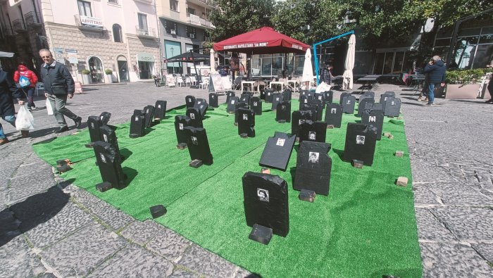 A Salerno non è passata inosservata l'installazione - non autorizzata - allestita nella notte in piazza Portanova. Intorno alle 4 ignoti hanno posizionato nel centro cittadino di Salerno una composizione, formata da un tappeto verde e diverse lapidi in polistirolo, sulle quali compaiono volti di bambini in bianco e nero.
