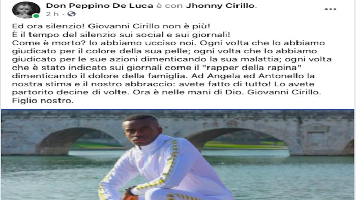 “Jhonny” aveva provato a riscattare una vita difficile attraverso la musica e attraverso il rap. Ma nelle scorse settimane era finito in carcere per alcuni guai giudiziari. «Non era un delinquente», scrivono in tanti sui social dove anche don Peppino De Luca, parroco della parrocchia San Francesco di Paola, lo ha ricordato con un toccante e significativo messaggio. «Ed ora silenzio! Giovanni Cirillo non è più! È il tempo del silenzio sui social e sui giornali! Come è morto? Lo abbiamo ucciso noi. Ogni volta che lo abbiamo giudicato per il colore della sua pelle; ogni volta che lo abbiamo giudicato per le sue azioni dimenticando la sua malattia; ogni volta che è stato indicato sui giornali come il "rapper della rapina" dimenticando il dolore della famiglia. Ad Angela ed Antonello la nostra stima e il nostro abbraccio: avete fatto di tutto! Lo avete partorito decine di volte. Ora è nelle mani di Dio. Giovanni Cirillo. Figlio nostro».