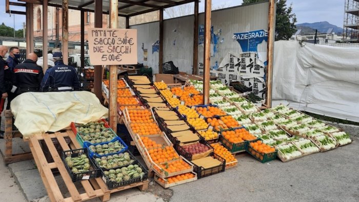 Portate via circa 100 cassette di frutta, corrispondenti a 190 chili di arance, 60 di patate, 40 di mele, 160 di finocchi e 35 di mandarini. La merce esposta era in vendita su precari scaffali di legno.