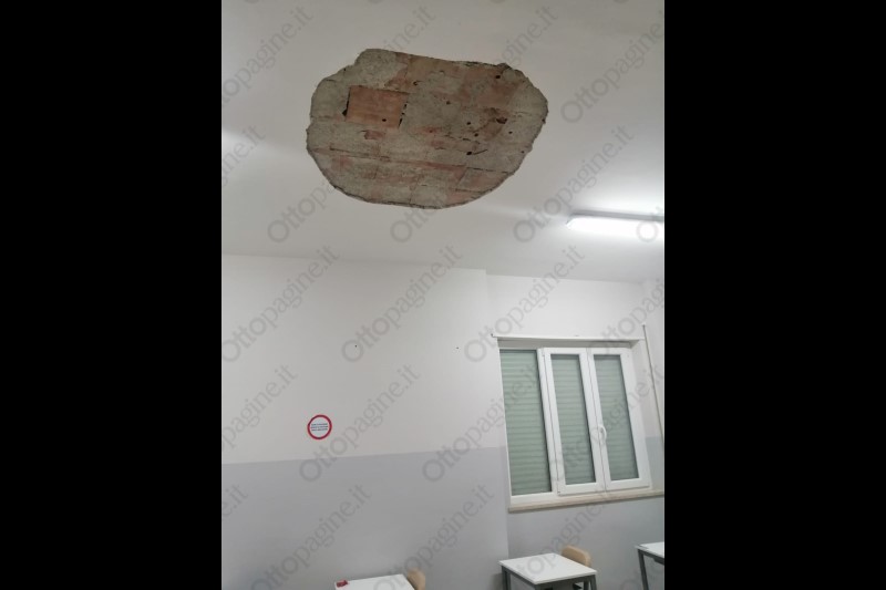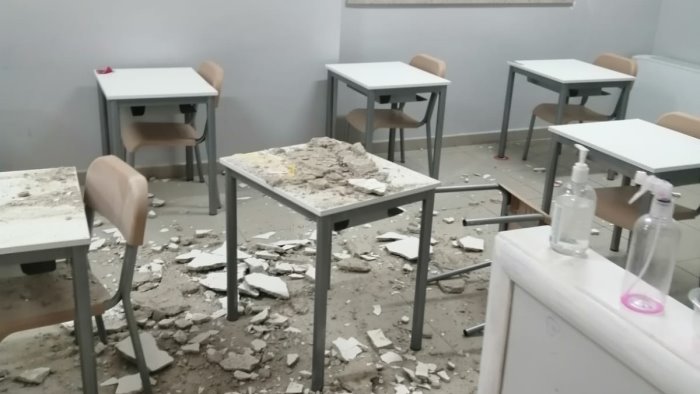 Grossi pezzi d’intonaco e calcinacci dal soffitto che si sono staccati, schiantandosi suo banchi di scuola pochi minuti prima che entrassero gli studenti.