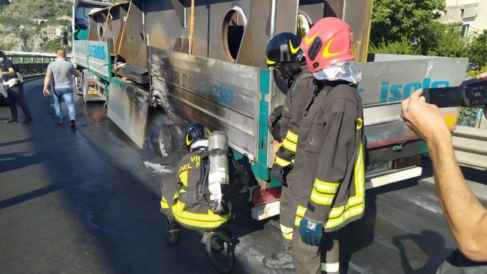 Un mezzo pesante ha preso fuoco: il rogo, a quanto risulta, si sarebbe propagato da uno pneumatico durante la marcia. L'autista ha immediatamente arrestato la marcia per evitare guai peggiori: sul posto sono intervenuti i vigili del fuoco del comando provinciale, che hanno messo in sicurezza il camion.