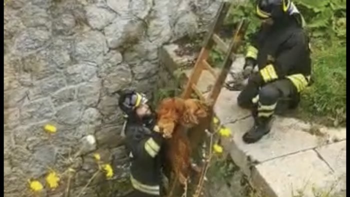 I caschi rossi, con l'ausilio di una scala, hanno così recuperato e salvato il cane, per poi affidarlo al personale del servizio veterinario dell’ASL. Fortunatamente, non avrebbe riportato ferite dalla caduta.