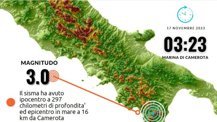 Un terremoto di magnitudo 3 e' stato registrato nel Golfo di Policastro, nel mare antistante le coste di Campania e Basilicata. Il sisma e' stato localizzato dalla Sala Sismica INGV-Roma. Il terremoto ha avuto ipocentro a 297 chilometri di profondita' ed epicentro in mare a 16 km da Camerota (Salerno). Non si registrano danni a persone o cose.