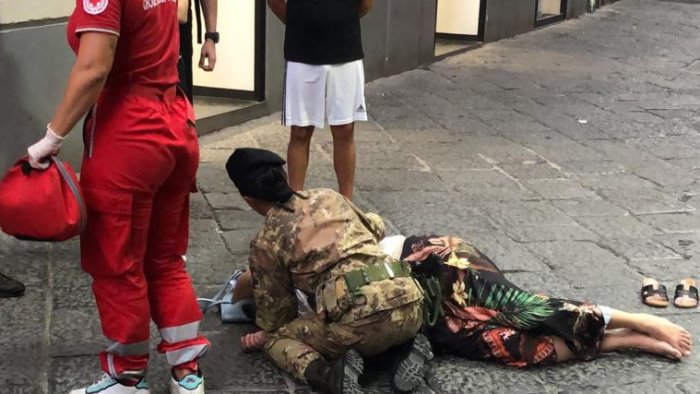 Richiamati dalle grida dei passanti, i militari dell’Esercito, appartenenti al reggimento “Cavalleggeri Guide” 19°, si sono avvicinati alla donna e hanno tempestivamente iniziato le manovre di primo soccorso, liberando le vie respiratorie ostruite e riuscendo, dopo diversi minuti, a farle riprendere conoscenza. I militari del raggruppamento “Campania” hanno poi continuato ad assisterla e monitorarla fino all’arrivo dei medici del 118.