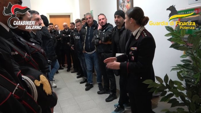 L’ordinanza, per la cui esecuzione sono stati impiegati un centinaio di militari delle due Forze di Polizia, supportati da unità cinofile, ha riguardato 23 persone che avrebbero commesso reati nel territorio del Vallo di Diano e nel capoluogo lucano. Gli indagati sono stati raggiunti da varie misure personali (arresti in carcere, arresti domiciliari, obbligo quotidiano di presentazione alla polizia giudiziaria e divieto di esercitare uffici direttivi di persone giuridiche e imprese). Nel corso delle perquisizioni effettuate sono stati sequestrati complessivamente circa 100.000,00 euro.
