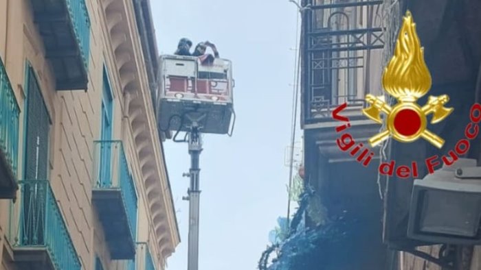 Dopo la rimozione parziale, da parte del comune, di alcune luminarie, con l'ausilio di un' A-Trid (cestello elevatore), i caschi rossi stanno verificando le parti alte degli stabili che insistono sui primi metri di via Mercanti lato piazza Portanova, per permettere di ripristinare la viabilità e permettere ai commercianti di riaprire i battenti.