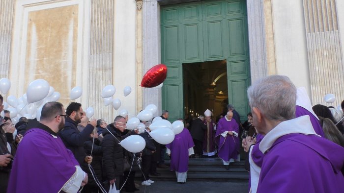 Il Duomo di Cava de' Tirreni era troppo piccolo per accogliere le tantissime persone che hanno voluto presenziare all'ultimo saluto, con palloncini bianchi e rossi all'uscita della bara al termine della funzione.