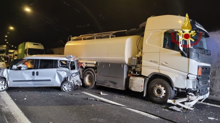 Traffico in tilt a Salerno per un incidente stradale avvenuto intorno alle 15 in galleria, subito prima dello svincolo per Salerno centro, in direzione dell'imbocco autostradale Salerno - Napoli. Per cause da accertare si è verificata una collisione tra un'autocisterna che trasportava gasolio e due autovetture, probabilmente in coda per lo svincolo. Ad avere la peggio l'uomo che era alla guida di una delle due autovetture per il quale è stato necessario l'intervento dei Vigili del Fuoco.