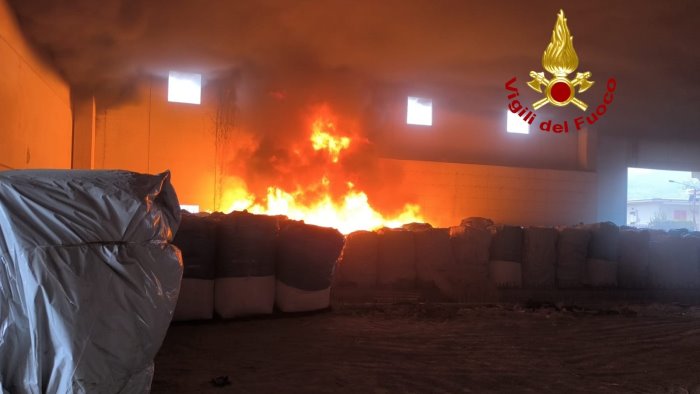 Le fiamme hanno distrutto un deposito di materiale plastico. La colonna di fumo nero era visibile anche a distanza.