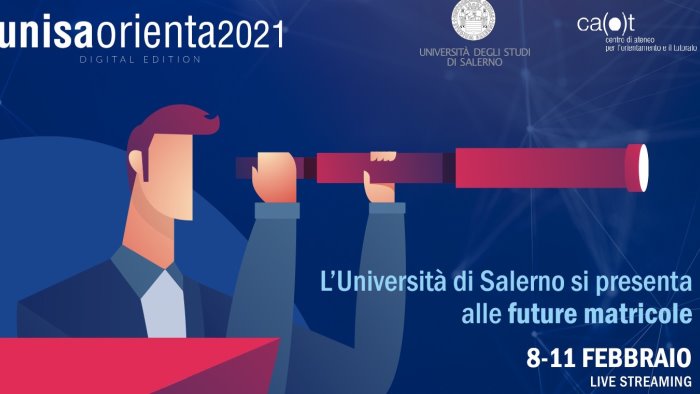 8-11 febbraio 2021. E' questa l'agenda della XVII edizione di UnisaOrienta, la manifestazione annuale che l'Ateneo di Salerno dedica all'orientamento in ingresso degli studenti delle scuole della Campania e delle altre regioni del Mezzogiorno. Obiettivo prioritario dell'evento, curato dal Centro di Ateneo per l'Orientamento ed il Tutorato (CAOT), è supportare ed accompagnare i giovani, le Future Matricole, nella entusiasmante e al contempo delicata fase della futura scelta del percorso universitario.