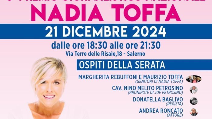 Tutto pronto per la quinta edizione del premio giornalistico nazionale "Nadia Toffa", organizzato dalla Fondazione Nadia Toffa e dal Nucleo operativo ambientale Sospasitalia, presieduto da Antonino Petrillo. Sabato 21 dicembre, alle 18,30, nei locali della Network GTC, in via Terre delle Risaie di Salerno, è prevista la serata di premiazione, alla presenza di Margherita Rebuffoni e Maurizio Toffa, genitori dell'indimenticata giornalista del programma televisivo "Le Iene" prematuramente scomparsa nel 2019. La mamma e il papà della Toffa consegneranno il premio nazionale a Enrico Didoni, giornalista del popolare format della Mediaset, che s'è distinto per incalzanti inchieste, specie in materia ambientale.