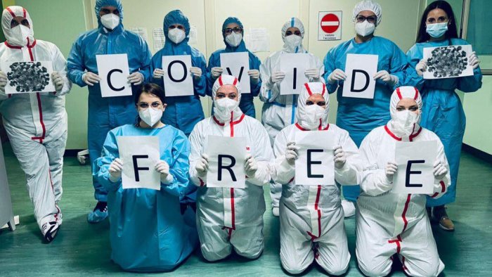 E così, questa mattina, medici, infermieri e personale sanitario, dal primo momento in prima linea contro questo nemico invisibile, ancora con tute, mascherine e protezioni, hanno "festeggiato" l'importante risultato raggiunto con un'immagine che è già simbolo di speranza e rinascita. "Covid free" si legge sui cartelli esposti e poi lanciati in aria. Un sospiro di sollievo e occhi che sorridono.