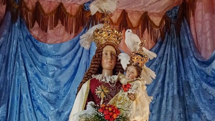 Canti, petali e coriandoli hanno accompagnato l'uscita della statua dal Santuario, questa mattina alle 9. La Madonna delle Galline, è stata poi esposta sul palco montato in piazza D'Arezzo, dove erano in programma quattro messe. Ma, come reso noto dal primo cittadino Raffaele De Prisco: