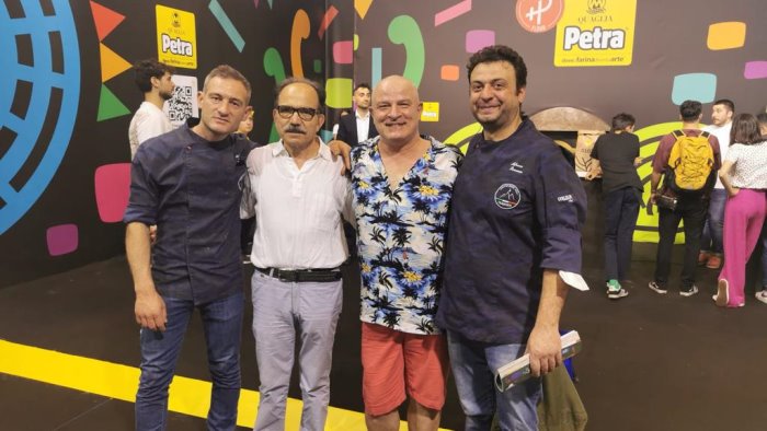 Successo condiviso con la nuova creazione del maestro e nostro associato Vincenzo Nese, che si è esibito nell’ultima giornata della fiera e che ha voluto omaggiare la sua terra d’origine con un trionfo di pomodorini gialli del Piennolo e pomodorini Corbarini, provola affumicata dei Monti Lattari, Alici di Cetara e grattugiata di Limoni delle due Costiere, portando in tavola una pizza che collega sapientemente mare e monti.