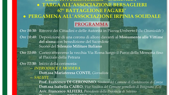 A partecipare alla manifestazione che vedrà la presenza tra le più alte cariche civili e militari, giungere da tutta Italia a Castelnuovo di Conza, ed in particolar modo da Campania, Calabria, Puglia, Sicilia e Basilicata, prenderanno parte il sindaco del comune di Castelnuovo di Conza, Francesco Di Geronimo, il vicesindaco del Comune gemellato della città di Bisignano, Isabella Cairo, il Presidente della Provincia di Salerno, Francesco Alfieri e il Prefetto di Salerno, Francesco Esposito. Presenta l’evento, patrocinato dalla Provincia di Salerno, la giornalista Mariateresa Conte. La cerimonia, che si svolgerà alla presenza di una rappresentanza della fanfara militare, vedrà il conferimento della cittadinanza onoraria alla Brigata Bersaglieri “Garibaldi” di Caserta che sarà ritirata dal generale Mario Ciorra, una targa all’Associazione Bersaglieri “67° Fagarè” che sarà consegnata a Leonardo Dinoi e una targa all’Associazione “Irpinia Solidale” consegnata al presidente il maresciallo ordinario Vitale Recce. All’evento saranno inoltre presenti tra le Autorità, il segretario nazionale di ACI- Automobile Club d’Italia, Gerardo Capozza, il presidente del comitato Croce Rossa Italiana di Serre, Giuliano d’Angelo, il vicepresidente della Provincia di Salerno, Giovanni Guzzo, il consigliere della Provincia di Salerno con delega al Turismo, Pasquale Sorrentino, i sindaci, il presidente della Comunità Montana Alto Medio Sele e Tanagro e presidente nazionale Associazione Asmel, Giovanni Caggiano, una delegazione di sindaci e consiglieri regionali provenienti da tutto il centro sud Italia, oltre che ai rappresentati delle Forze Armate e della Polizia dei comandi provinciali, e il Presidente del Parco Nazionale del Cilento Vallo di Diano e Alburni, Giuseppe Coccorullo. Alla manifestazione inoltre, è stato invitato anche il presidente nazionale di ANCI e sindaco della città di Bari, Antonio De Caro.
