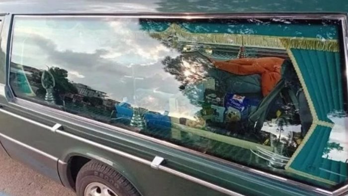 Borse, sacchi a pelo, buste con abiti e vettovaglie: tutto l'occorrente, insomma, per un viaggio. Ma stipate all'interno... di un carro funebre. Nello spazio, insomma, che di solito viene utilizzato per accogliere la bara ed i fiori.