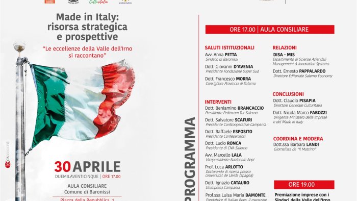 Mercoledì 30 aprile 2025, alle ore 17.00, l’Aula Consiliare del Comune di Baronissi ospiterà un importante momento di confronto e valorizzazione dedicato al sistema produttivo italiano, con il convegno “Made in Italy: risorsa strategica e prospettive”, promosso nell’ambito della Giornata Nazionale del Made in Italy. L’iniziativa, realizzata con il sostegno della Fondazione Super Sud, Culturitalia, Provincia di Salerno e con il patrocinio del Ministero delle Imprese e del Made in Italy, nasce con l’obiettivo di evidenziare il ruolo delle imprese locali nella costruzione dell’identità economica e culturale del Paese.