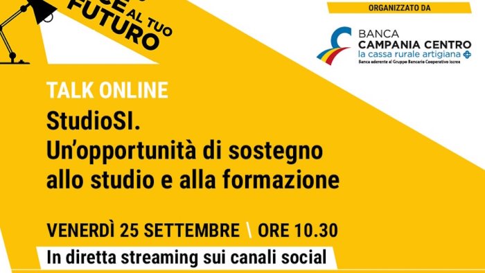 Con il talk online in diretta su Facebook dal titolo “StudioSi. Un’opportunità di sostegno allo studio e alla formazione”, prendono il via i live di approfondimento di Banca Campania Centro. Nel corso del primo appuntamento, in programma il 25 settembre alle 10,30, verrà presentato il programma di finanziamento a tasso zero per studio e formazione StudioSI, gestito dalla Banca Europea per gli Investimenti (BEI) attraverso il Gruppo Bancario Cooperativo ICCREA. Lo strumento è rivolto a giovani che intendono proseguire il proprio percorso di studi, in Italia e all'estero, e per sostenere il costo delle tasse universitarie e delle altre spese per la formazione (Università, Master, scuole di specializzazione accreditate dal Miur) grazie a modalità di credito vantaggiose che non richiedono garanzie e fideiussioni. Un’occasione per completare gli studi nell’ottica di una “democrazia delle opportunità” e di usufruire di formazione specialistica, attivata anche da enti di formazione in collaborazione con le Università.