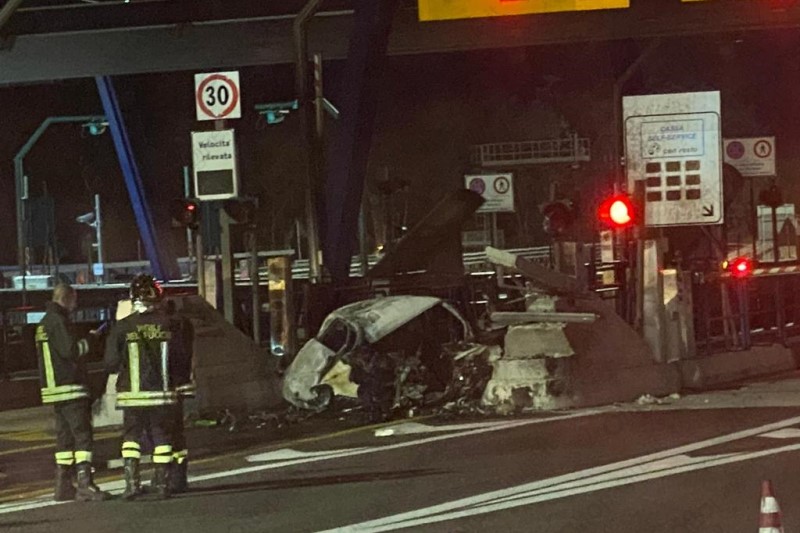 Dopo l'impatto l'auto è stata avvolta dalle fiamme, sul posto i vigili del fuoco