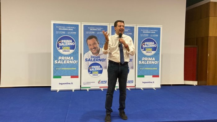 «Questa è terra di De Luca che più che un governatore si sente un monarca e più che cittadini ha sudditi a cui imporre obblighi, mute e divieti. Salerno è una bella città, i salernitani sono persone di valore, di lavoro. Gli imprenditori salernitani non mi chiedono aiutini, redditi a caso. Anzi ci sarà da rivedere il criterio di ripartizione dei redditi di cittadinanza che spesso vanno a persone che non ne hanno diritto, offriamo un’idea diversa di città. E la offriamo tutti insieme». Matteo Salvini, arrivato a Salerno per sostenere la candidatura a sindaco di Michele Sarno, ha lanciato bordate a Vincenzo De Luca. «De Luca è un po’ in difficoltà in questo momento. Io non mi permetto di dire non votate a sinistra a Salerno. Donne ed uomini di Salerno hanno la libertà di scegliere, il centrodestra è unito, compatto, ha un candidato serio e una squadra credibile. La storia della politica mi insegna che quando uno passa il tempo ad insultare l’altro, significa che ha paura. Allora io penso che De Luca abbia parecchia paura perché ne ha sbagliate tante in questi mesi».