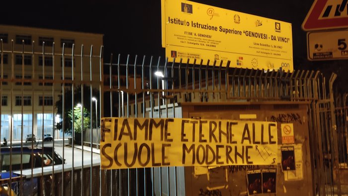 Ai cancelli dell'istituto superiore Genovesi Da Vinci è stato affisso uno striscione che recita “Fiamme eterne alle scuole moderne”.
