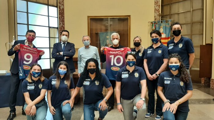 Questa mattina il Sindaco di Salerno Vincenzo Napoli e l'Assessore all'Ambiente e allo Sport del Comune di Salerno Angelo Caramanno hanno ricevuto a Palazzo di Città squadra e dirigenza della Jomi Salerno, a pochi giorni dalla vittoria del Campionato nazionale di pallamano femminile. Al termine della breve cerimonia il presidente Mario Pisapia ha consegnato maglie personalizzate della formazione allenata da coach Laura Avram al primo cittadino Vincenzo Napoli ed all'Assessore allo sport ed all'Ambiente Angelo Caramanno. “E' stato un anno particolare – afferma il presidente Mario Pisapia – perchè la variabile sportiva non era l'unica con cui combattere. Una stagione che fortunatamente è trascorsa velocemente anche se abbiamo pagato dazio poiché nel momento di maggiore forma della squadra abbiamo dovuto fare i conti con il Covid e la pandemia. Sapevamo di dover vivere alla giornata, quello che riuscivamo a fare cercando di rispettare nei minimi dettagli tutte le precauzioni. E' stato uno sforzo organizzativo enorme, ringrazio quindi tutto lo staff, grazie anche al loro aiuto siamo riusciti a rispettare alla lettera tutti i protocolli”. Complimenti alla Jomi Salerno anche da parte del primo cittadino Vincenzo Napoli che ha affermato: “Salerno si tinge tricolore, ancora una volta, grazie alle meravigliose ragazze della Pdo Jomi Salerno, neo-vincitrici del campionato di pallamano femminile. Un ennesimo straordinario risultato per giocatrici e società ormai da anni stabilmente ai vertici nazionali della disciplina. Dopo la storica promozione della Salernitana, un’altra grande gioia per la Salerno sportiva”. Infine l'Assessore Angelo Caramanno: “La Jomi Salerno – afferma – ha fatto l'ennesimo capolavoro portando la nostra realtà sul tetto d'Italia della pallamano. Come amministrazione non possiamo che essere felici di avere un movimento sportivo così forte che dà lustro all'intera città di Salerno”