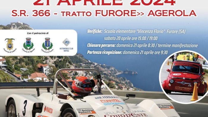 Tornano le auto da corsa nello Slalom organizzato dall’Automobile Club Salerno nella splendida cornice della Costa d’Amalfi per la XXXII edizione della Coppa Primavera. Le vetture di importanti team e di tanti singoli corridori saranno sulla griglia di partenza a Furore per poi arrivare ad Agerola per il parco chiuso e per la premiazione. Per consentire lo svolgimento della gara è stata prevista, per domenica 21 aprile, la chiusura al traffico veicolare e la sospensione temporanea della circolazione pedonale della strada provinciale ex S.R 366 Agerolina nel comune di Furore dal chilometro 6 in località via Mola fino al chilometro 11 in via Belvedere, 49 dalle ore 8 alle 18 e, in ogni caso, fino al termine della gara.