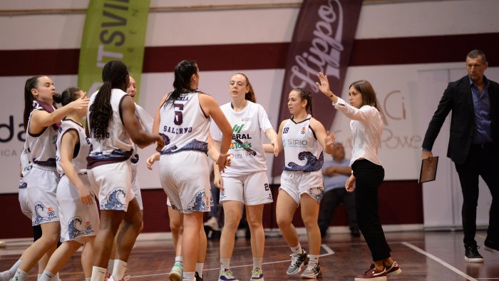 La partita. Primo break 6-0 Salerno in un paio di minuti, poi Pollini con due triple per la parità. Salerno sprinta con la fisicità di Silatsa e la chirurgica precisione di Oliveira, le umbre restano a contatto: +4 per le campane a 3:30” dalla prima pausa. Timeout chiamato da coach Visnjic sul 14-10, gara molto fisica. Difesa ok per le granatine, che chiudono il primo quarto sul 18-12. Si riprende con Salerno on fire, subito a +10. L’impatto sulla partita di Scala e Takrou è di quelli importanti. L’ex Ancona a metà periodo sale in cattedra e anticipa tutti trasformando l’azione da difensiva in offensiva per il 32-16. Valerio e De Mitri sul pezzo, soprattutto nella fase di non possesso. Orchi dà del filo da torcere all’ex Cragnolino, costringendola ad applicarsi dalla lunga distanza. Ne infila due, poi replica sull’altro fronte Oliveira, regista di assoluto spessore. Partita bellissima, difesa arcigna: Salerno vola a +18, poi ancora l’argentina e Parolai rosicchiano qualcosa e si va all’intervallo lungo sul 43-29. Nel terzo quarto per quasi tre giri di lancette nessuno segna. Sblocca Oliveira in contropiede per Salerno che beneficia di una Silatsa incontenibile (30 punti finali, top scorer) e di una difesa top. Più lucida anche dalla lunetta la formazione di Visnjic che riesce a non perdere terreno alla mezzora (57-41). Alta intensità, subentra anche un pizzico di stanchezza per le due squadre. Sirio comunque a +20 con Silatsa a 7’ dalla fine (61-41). Dopo due minuti va fuori Scala, quinto fallo. Salerno perde lucidità e qualche pallone troppo ingenuamente in attacco, precludendosi la possibilità di un allungo importante seppur con una difesa buona. Finisce comunque 71-55, un buon margine per affrontare il match di ritorno con consapevolezza dei propri mezzi.