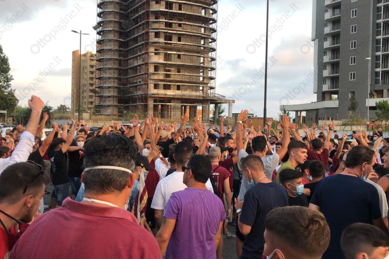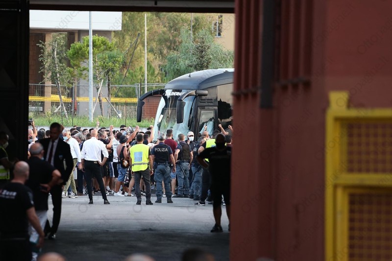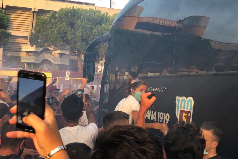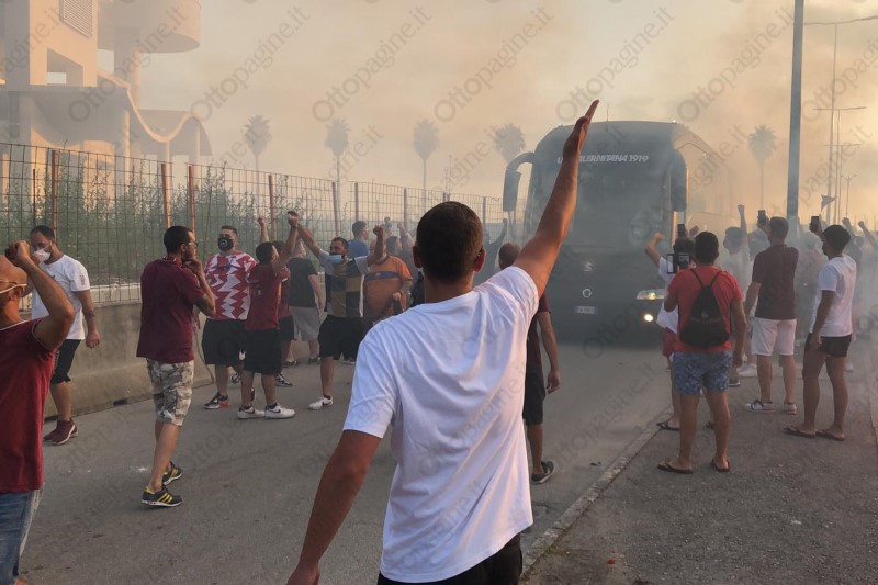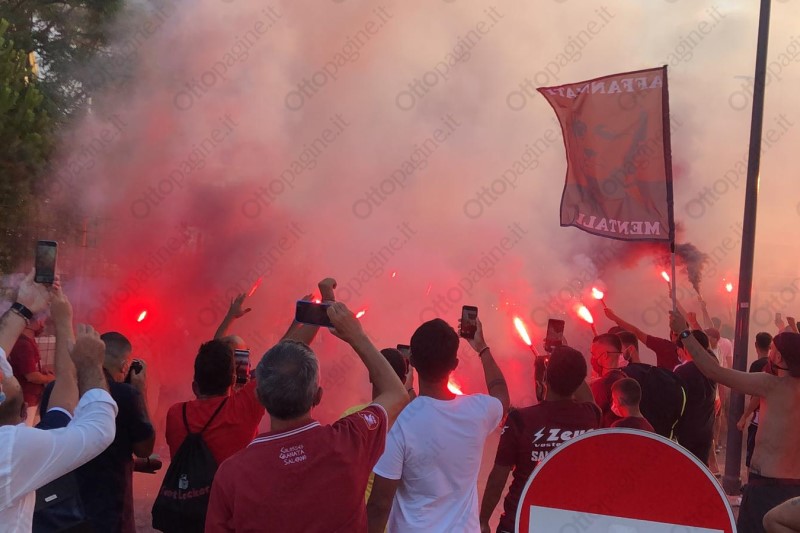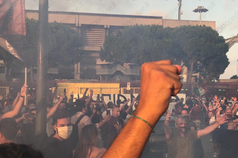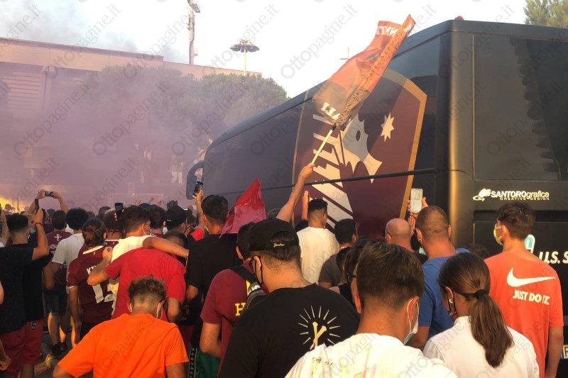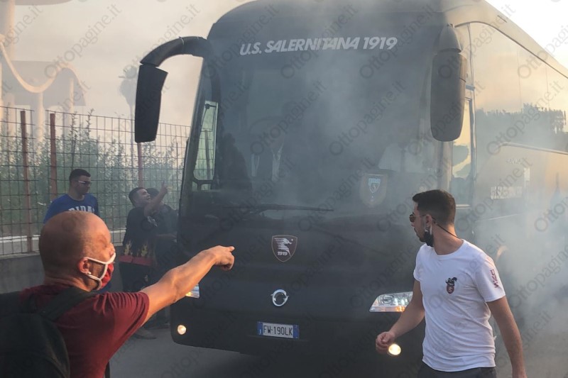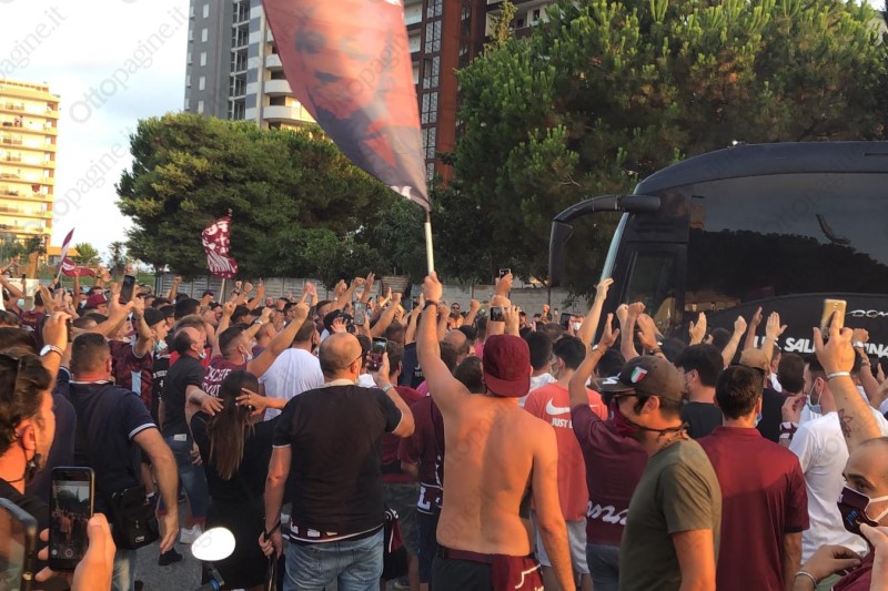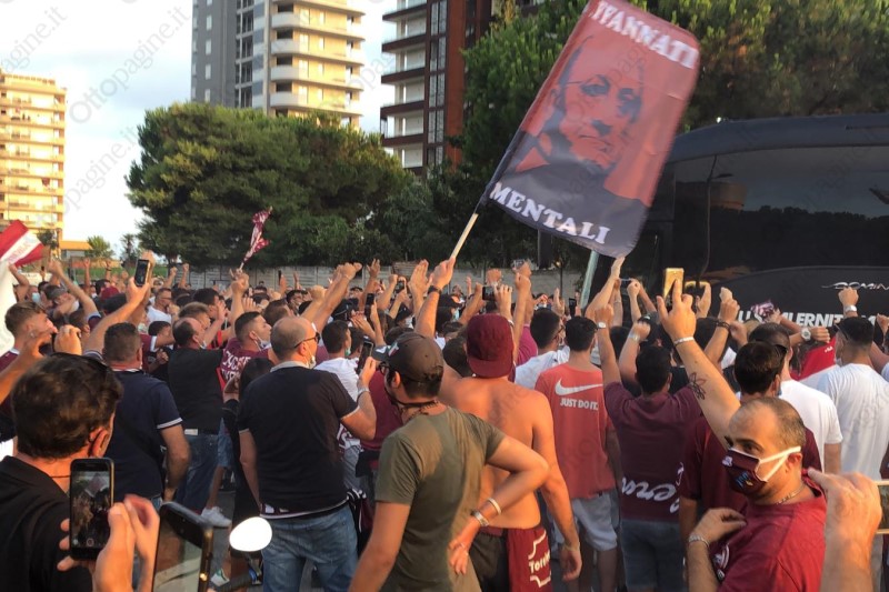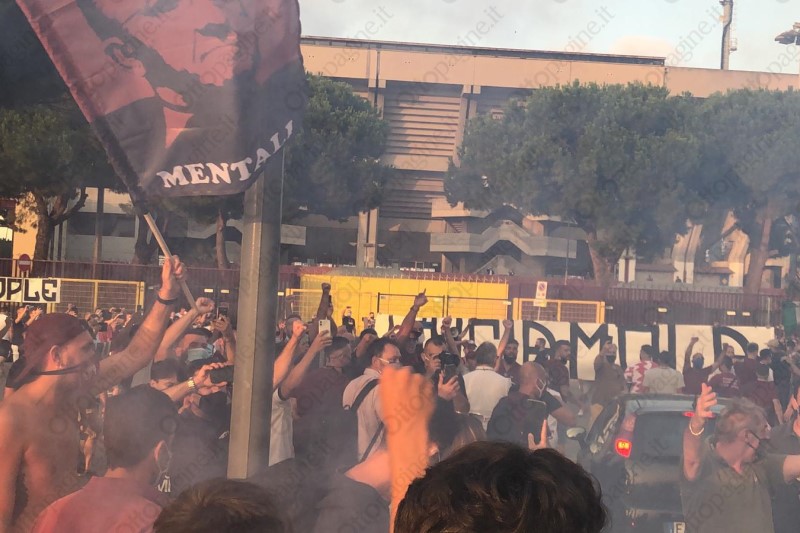 Un cordone umano a tinte granata ha scortato la Salernitana fino all'ingresso del varco 25 dello stadio Arechi. «Ci devi credere, vinciamo», la colonna sonora intonata da oltre 300 tifosi che, armati di bandiere, fumogeni (e mascherine) hanno provato a dare la carica ai calciatori granata che alle 21 affronteranno lo Spezia nella sfida decisiva per l'accesso ai play-off. Un segnale importante che testimonia l'attaccamento e la passione del popolo granata, intenzionato a vincere quest'ultima sfida di campionato per andarsi a giocare i play-off. Scene d'entusiasmo che non si vedevano da tempo e che, in parte, hanno cancellato il clima di scetticismo che ha accompagnato gran parte della stagione. Per 90' Salerno tornerà ad essere compatta per spingere il cavalluccio marino nella post-season.