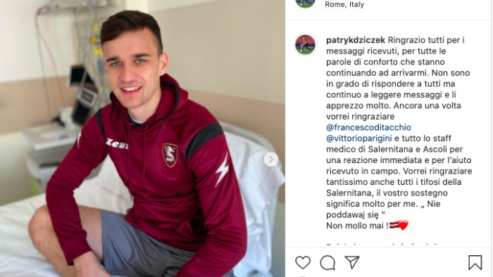 «Ringrazio tutti per i messaggi ricevuti, per tutte le parole di conforto che stanno continuando ad arrivarmi. Non sono in grado di rispondere a tutti ma continuo a leggere messaggi e li apprezzo molto. Ancora una volta vorrei ringraziare Francesco Di Tacchio, Vittorio Parigini e tutto lo staff medico di Salernitana e Ascoli per una reazione immediata e per l’aiuto ricevuto in campo. Vorrei ringraziare tantissimo anche tutti i tifosi della Salernitana, il vostro sostegno significa molto per me. „ Nie poddawaj sie ” Non mollo mai !». È il messaggio che Patryk Dziczek, centrocampista della Salernitana, ha diffuso attraverso il suo profilo Instagram. Il calciatore ha pubblicato anche una foto che lo ritrae nella struttura sanitaria romana nella quale è ricoverato per accertamenti. Sui social, inoltre, il centrocampista ha pubblicato lo striscione affisso dagli ultras della Salernitana dinanzi allo stadio Arechi e con il quale invitavano Dziczek a non mollare. «Non mollo mai», la risposta del talento dell'Under 21 polacca che spera di mettersi quanto prima alle spalle questa brutta esperienza.
