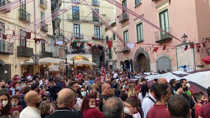 Tra le strade del centro storico di Salerno, stasera ancor di più, la salernitanità si tagliava a fette. "Odore" che solitamente si respira tra i vicoletti della città vecchia, imbattendosi tra antiche botteghe, famiglie storiche e tradizioni che si tramandano di padre in figlio. E che oggi per qualche ora ha riempito Largo Sedile del Campo. Il “vecchio” Largo Campo, tradizionalmente punto di ritrovo degli adolescenti nelle notti della movida, ha abbracciato migliaia di bambini bardati di granata, tramandando con un testamento spontaneo quella passione che all’ombra dell’Arechi ha più d’un secolo. Uno spettacolo organizzato dagli ultras del Centro Storico che hanno voluto dedicare la loro festa per la promozione in serie A della Salernitana alle future leve del tifo granata, quelle che la serie A non l’avevano mai vista.