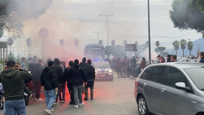 Circa 200 tifosi hanno atteso all'esterno dell'Arechi l'arrivo del pullman della Salernitana. Il bus sociale, scortato da auto e motorini, è arrivato in via Allende intorno alle 16.45. Tanti altri sostenitori erano già all'interno dello stadio da dove hanno fatto sentire il proprio calore ai propri beniamini. Per il derby con il Napoli, che ritorna in serie A dopo 73 anni, sono attesi 18mila spettatori. Ingente il dispiegamento di forze dell'ordine: oltre 200 uomini stanno presidiando sia l'area attorno all'Arechi che il percorso che conduce allo stadio. Presidiati anche i cavalcavia del raccordo autostradale Salerno-Avellino e gli svincoli della tangenziale. La situazione viene monitorata dall'alto anche con l'ausilio di un elicottero che sta sorvolando la città dalle 15. Controlli anche all'uscita della tangenziale dove gli agenti controllano la provenienza dei tifosi.