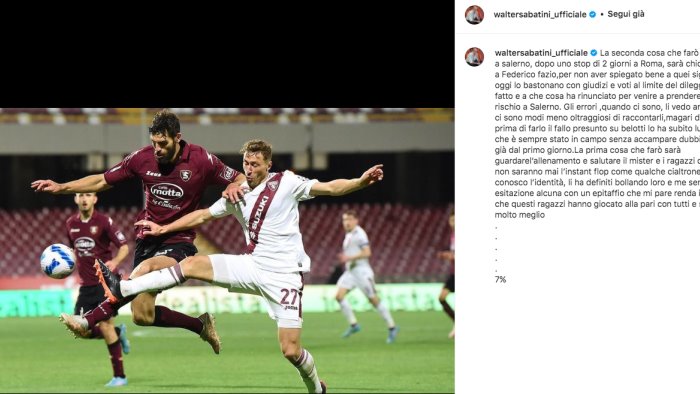 Walter Sabatini rompe il silenzio e, dopo la sconfitta contro il Torino, fa scudo su calciatori e squadra. Il dirigente della Salernitana, con un lungo post pubblicato su Instagram, ha voluto difendere senza mezzi termini Federico Fazio ed i suoi compagni, evidenziando l'impegno e la determinazione che sono stati messi in campo dai granata. «La seconda cosa che farò rientrando a Salerno, dopo uno stop di 2 giorni a Roma, sarà chidere scusa a Federico Fazio, per non aver spiegato bene a quei signori che oggi lo bastonano con giudizi e voti al limite del dileggio, cosa ha fatto e a che cosa ha rinunciato per venire a prendere questo rischio a Salerno. Gli errori, quando ci sono, li vedo anche io, ma ci sono modi meno oltraggiosi di raccontarli, magari dicendo che prima di farlo il fallo presunto su Belotti lo ha subito lui stesso e che è sempre stato in campo senza accampare dubbi o scuse già dal primo giorno. La prima cosa che farò sarà guardare l’allenamento e salutare il mister e i ragazzi che per me non saranno mai l’instant flop come qualche cialtrone di cui non conosco l’identità, li ha definiti bollando loro e me senza esitazione alcuna con un epitaffio che mi pare renda inutile dire che questi ragazzi hanno giocato alla pari con tutti e spesso molto meglio», il post pubblicato dal direttore sportivo della Salernitana che ha scatenato centinaia di commenti da parte dei tifosi granata, quasi tutti di sostegno e stima nei confronti del dirigente granata.