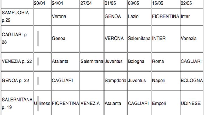 Va detto, però, che gli uomini di Davide Nicola dovranno riuscire a sbloccarsi in via Allende dove, fin qui, hanno conquistato soltanto un successo stagionale. Gli scontri diretti, tra l'altro, saranno una costante di questo rush finale di stagione: la Sampdoria dovrà vedersela con il Genoa che a sua volta incrocerà Cagliari e Venezia. Anche le squadre in corsa per lo scudetto potrebbero “decidere” la corsa salvezza: la Sampdoria all'ultima giornata sarà di scena in casa dell'Inter; i nerazzurri alla penultima sfideranno in Cagliari in trasferta. Nella stessa giornata il Napoli ospiterà il Genoa al “Maradona”. Venezia e Genoa, inoltre, dovranno ancora affrontare anche la Juventus. Una serie d'incroci che risulterà decisiva nella corsa salvezza. Ma è chiaro che la Salernitana per riuscire nell'impresa dovrà pensare soprattutto a far risultato: servono almeno 5 vittorie nelle ultime 7 per sperare di restare in serie A.