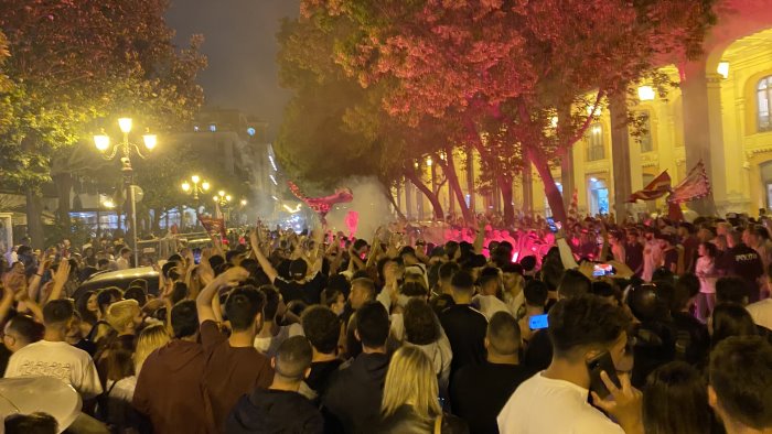 È esploda la festa a Salerno. Dallo stadio Arechi al centro città un'ondata di fumogeni, bandiere, striscioni e caroselli d'auto e motorini hanno tinto di granata i quartieri e le piazze. Folla davanti al Comune dove continuano a risuonare le canzoni più amate. Presenti anche tantissimi bambini. Un nutrito dispiegamento di forze dell'ordine monitora tutta la città.