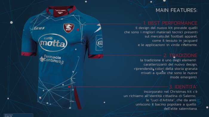 Un bellissimo kit speciale della Salernitana - il Galaxy Kit - per onorare ancor di più il legame che unisce la società alla città. Il motivo dell'elaborazione di un kit speciale, in edizione limitata, è legato alla celebrazione di Luci d'Artista, manifestazione cardinale per Salerno che, quest'anno, raggiunge la sua diciassettesima edizione. La notizia di questa speciale collaborazione tra Comune e Società è stata rilanciata proprio sul sito ufficiale dell Salernitana, dove si afferma che "Il Galaxy Kit unisce i colori della tradizione granata alle atmosfere natalizie di Luci d’Artista ed è realizzata con i materiali migliori presenti sul mercato come il tessuto in jacquard e le applicazioni in vinile riflettente." La divisa speciale sarà reperibile solo per un breve periodo di tempo. Il Galaxy Kit sarà venduto esclusivamente all’asta sulla piattaforma CharityStars e il ricavato dell’asta sarà devoluto a quattro associazioni benefiche attive quotidianamente su diverse tematiche: Fondazione Veronesi, A.I.L., A.I.R.C. e Open Onlus.