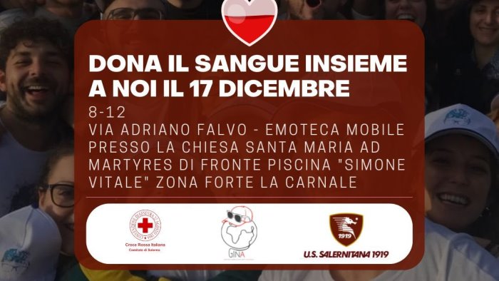Come aveva specificato l'amministratore delegato della Salernitana Maurizio Milan, ospite della trasmissione di Ottochannel "Granatissimi", la società intende puntare fortemente su progetti di natura sociale. Una tendenza confermata dal supporto offerto per la prossima iniziativa dell'Associazione Gina e della Croce Rossa Salerno. Questo sabato 17 dicembre, dalle 8:00 fino alle 12:00, in via Adriano Falvo presso la chiesa Santa Maria ad Martyres si terrà una nuova giornata dedicata alla raccolta del sangue.