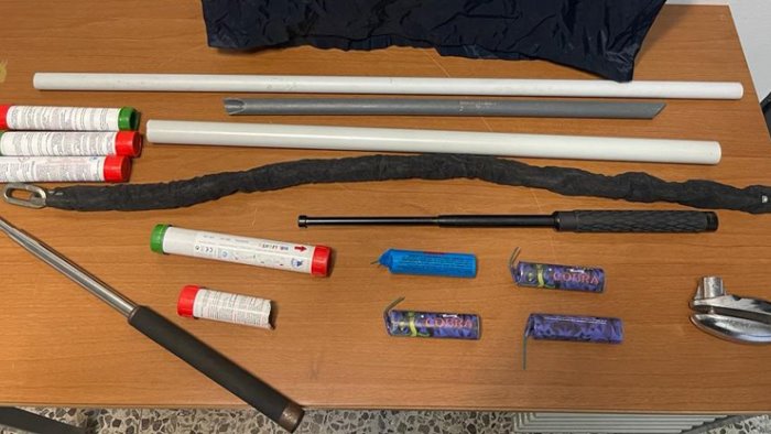 In un minivan, inoltre, durante i controlli è stata rinvenuta una decina di grossi tubi di plastica rigida. I possessori del materiale, tre tifosi di 47, 44 e 24 anni, tutti originari di Salerno, sono stati identificati e denunciati. Successivamente, durante i controlli effettuati al prefiltraggio, un 39enne è stato sorpreso con un coltellino a serramanico di 10 centimetri, nascosto in una tasca dei pantaloni; un 24enne, invece, è stato trovato in possesso di un tubo telescopico in metallo che era nascosto nel giubbotto. Entrambi sono stati deferiti all’autorità giudiziaria per “divieto di portare armi nelle riunioni pubbliche, anche a chi è in possesso di licenza”. Un tifoso leccese di 22 anni, invece, è stato trovato in possesso di tre fumogeni e un manganello telescopico in metallo.