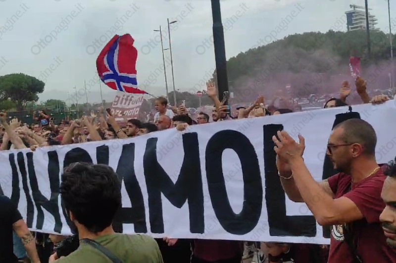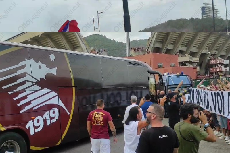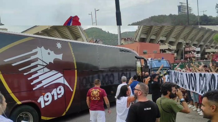 È nei momenti di difficoltà che la tifoseria granata serra i ranghi. E giunti alla quinta giornata di campionato, la Salernitana ha bisogno come non mai dei suoi tifosi. Così a poche ore dal fischio d'inizio di Salernitana-Frosinone i sostenitori granata hanno organizzato una concentrazione davanti al punto d'entrata del pullman che porta i giocatori all'interno dello stadio. Lo striscione: "Noi con voi, voi con noi. Vinciamola!" ha accolto gli uomini di casa, salutati anche da cori e messaggi d'incitamento.