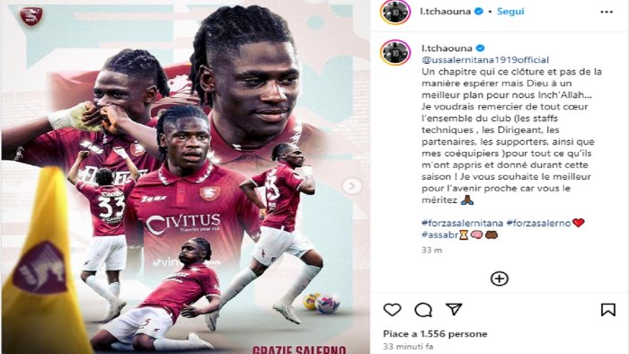 Il 20enne, protagonista di una discreta stagione con il cavalluccio marino sul petto che gli ha permesso di catturare l'occhio della società biancoceleste, ha salutato la città attraverso i social. "Un capitolo che si chiude e non come speravamo, ma Dio ha un piano migliore per noi - il messaggio postato in rete da Loum Tchaouna - . Ringrazio di cuore tutta la società (lo staff tecnico, i dirigenti, i soci, i tifosi, nonché i miei compagni) per tutto quello che mi ha insegnato e dato in questa stagione! Vi auguro il meglio nel prossimo futuro perché ve lo meritate", ha concluso Tchaouna che ha salutato tutti con un "Grazie Salerno".