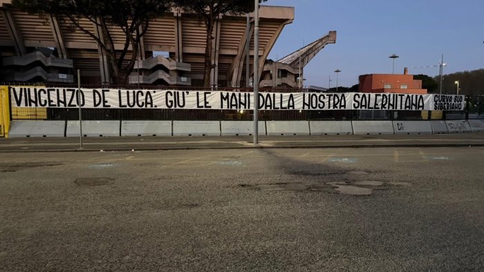 Dalla preoccupazione allo striscione. La fibrillazione intorno alla Salernitana sconfina anche nel mondo politico. Nella giornata di ieri Vincenzo De Luca si era soffermato sulla situazione granata, palesando pensieri sinistri sulle vicende del club. In serata però, è arrivato il messaggio perentorio della Curva Sud Siberiano: Vincenzo De Luca: “Giù le mani dalla nostra Salernitana”, il messaggio esposto in più punti della città. Il clima si fa dunque incandescente. Dopo l’appello di Danilo Iervolino (a politica e tifoseria) per trovare un imprenditore solido, è arrivata la replica dell’ex Governatore della Campania, e candidato sindaco alle prossime tornate amministrative. Ora la risposta del tifo organizzato della Bersagliera.